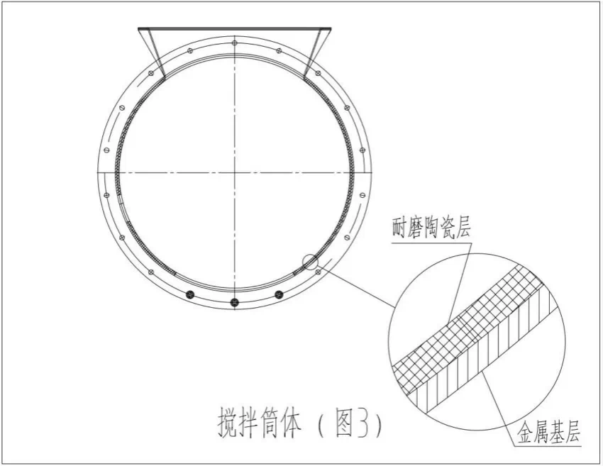 如图3所示,由普通钢板卷制而成的搅拌筒体,由于搅拌筒体的内表面为弧形,为便于具体实施耐磨陶瓷内层,耐磨陶瓷内层由若干与搅拌筒体的内表面弧度匹配的耐磨陶瓷内层单体拼合而成,采用高强度陶瓷结构胶粘贴,耐磨陶瓷内层与搅拌筒体的内表面不会产生剥离、脱落现象,可确保耐磨陶瓷内层在高温下长期运行而不脱落,有效保证使用性能。在极易受到石英沙和水泥等物料磨损的搅拌筒体的内侧工作面上覆设耐磨且强度高的耐磨陶瓷内层,可有效减少搅拌筒体所受到的磨损,延长搅拌筒体的使用寿命。