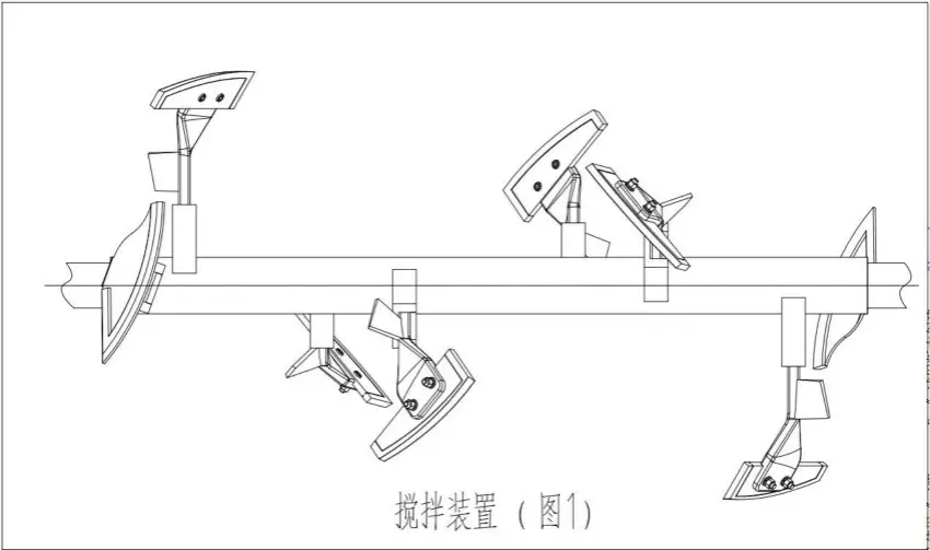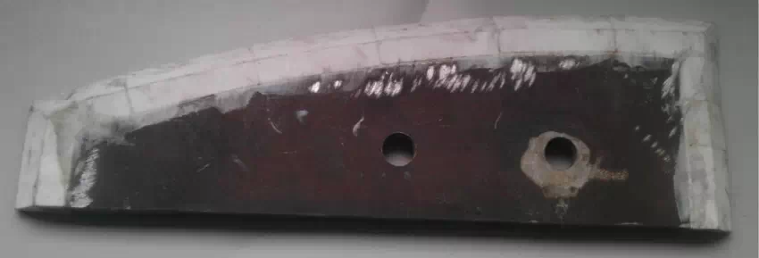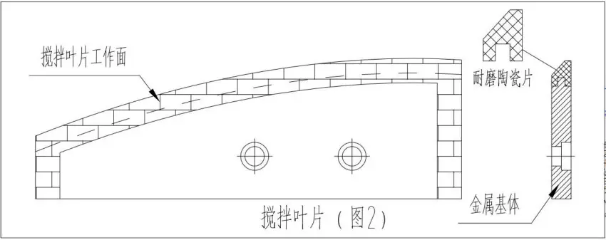 在本文中,针对强制式单轴干混砂浆搅拌主机进行说明。如图1所示,干混搅拌主机的搅拌装置的搅拌叶片边沿均覆设耐磨陶瓷层。如图2所示,搅拌叶片金属本体边沿进行机加工预处理,耐磨陶瓷片设有卡口,卡口与搅拌叶片金属本体相配合安装,采用高强度陶瓷结构胶将耐磨陶瓷片与叶片本体进行相互胶合,整个搅拌叶片边沿由若干片耐磨陶瓷片组成,连接顺滑而平整。耐磨陶瓷层在搅拌叶片本体摩擦搅拌的工作面的边缘形成包角,此结构可对受摩擦强度较高的搅拌叶片本体的工作面的边缘进行包裹保护,避免搅拌叶片本体与所搅拌的物料直接硬性接触,有效地防止搅拌叶片受到磨损。具有结构简单,实施方便且强度高特点。